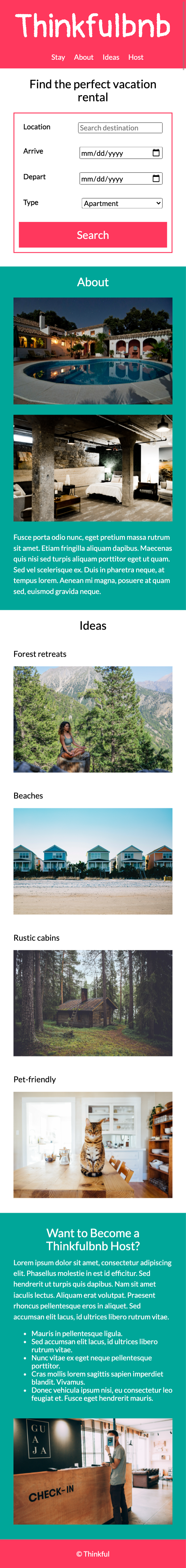 - The content in the remainder of the sections (i.e., "About", "Ideas", "Want to become a Thinkfulbnb Host?"), including any text and images, should stack on top of each other. Refer to the mobile design shared above.