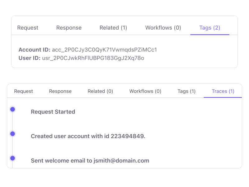 Tagging allows requests to be searchable by any number of tags that have been added to requests. For example, requests can be tagged by account or user ids which would then allow your team to view all API reqeusts for a specific account/person. There is no limit to the number of tags that can be added.