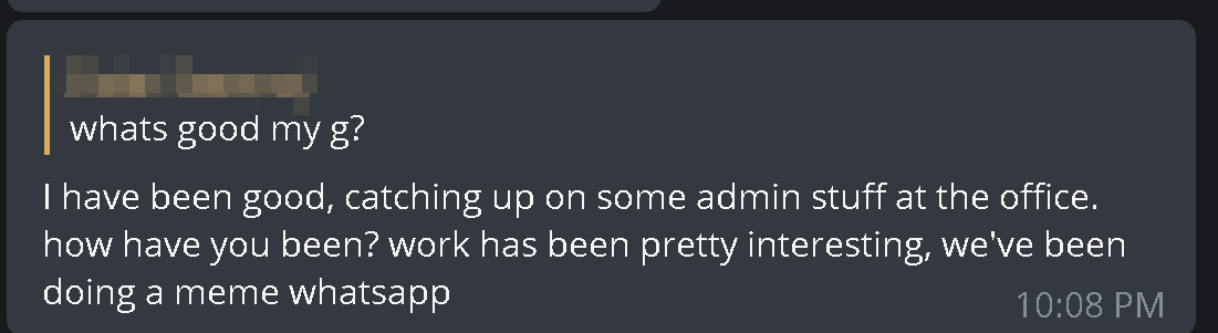 This response is from a bot on Telegram, finetuned on the author's messages