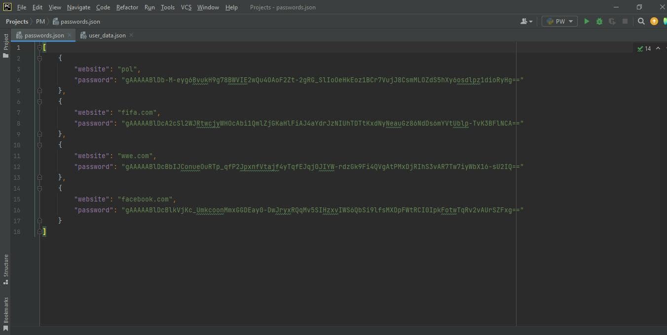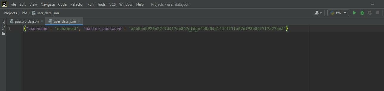 The passwords.json file is where we’ll store our saved passwords, and the user_data.json is where we will store login credentials. Please bear in mind that you do not have to create these files beforehand as we do that automatically in the program.