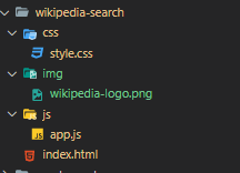 Second, create three folders inside the wikipedia-search folder called js, css, and img. These folders will store JavaScript, CSS, and image files accordingly.